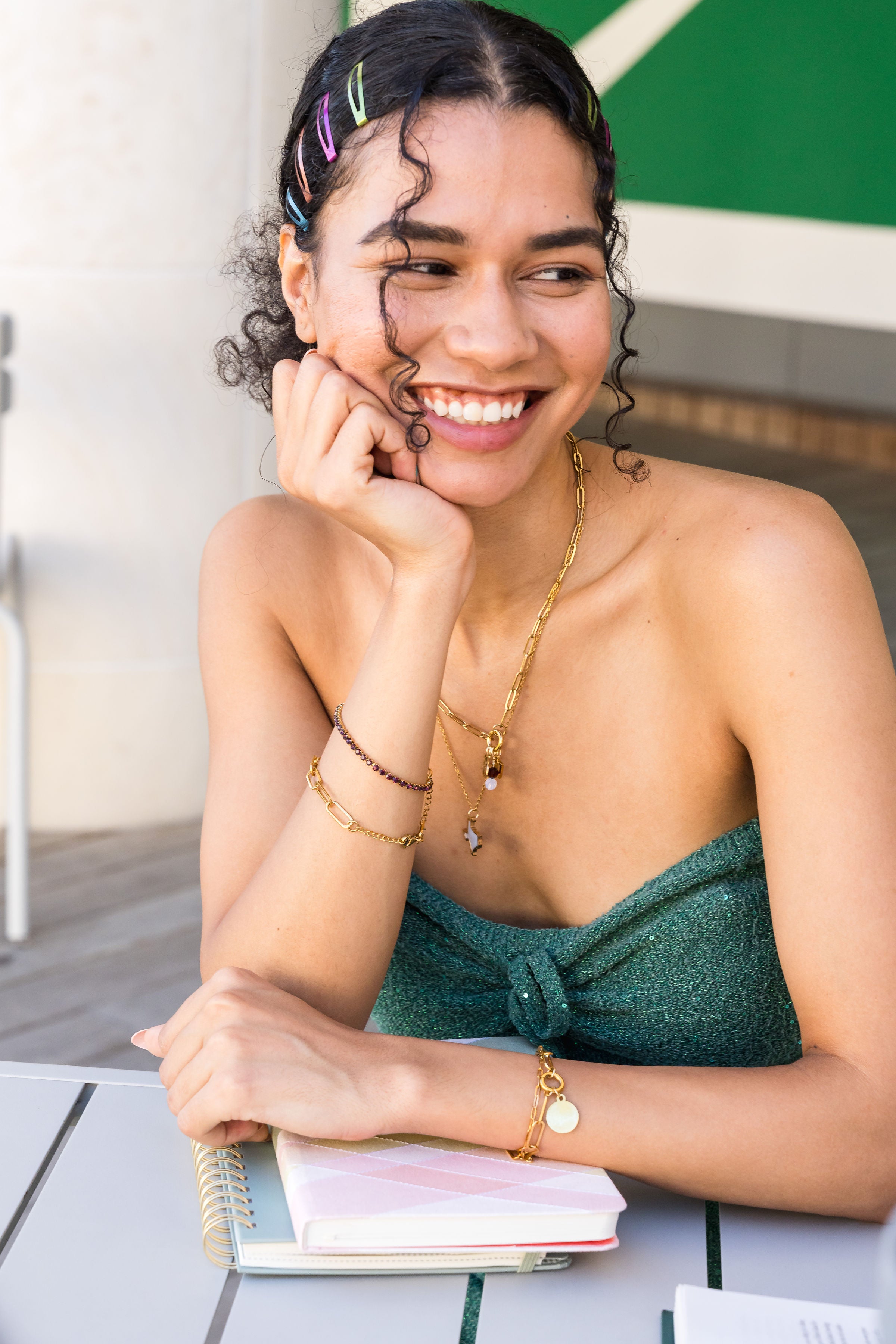 Made with 316L surgical grade stainless steel coated in 18K PVD gold, meaning it’s sweat-proof, swim-proof, and shower-safe. No tarnish, no fading—just nonstop shine, no matter how hard you play. Accented with brilliant CZ stones for diamond-like sparkle. Clasp- 18k gold PVD lobster clasp.