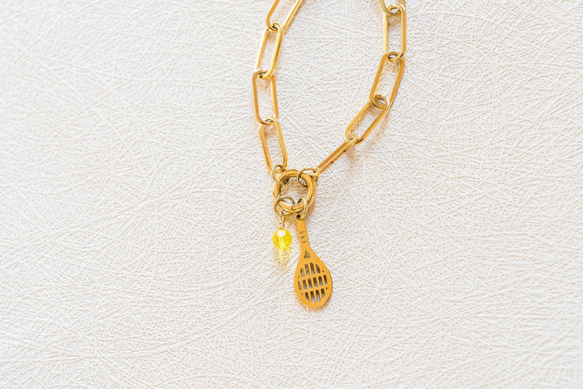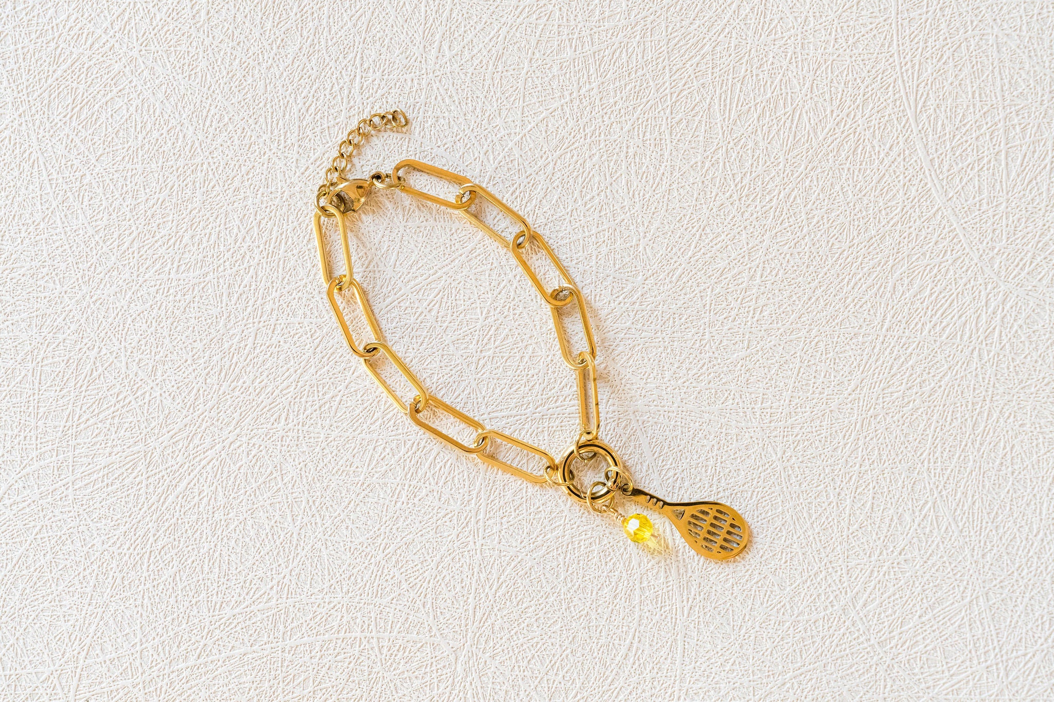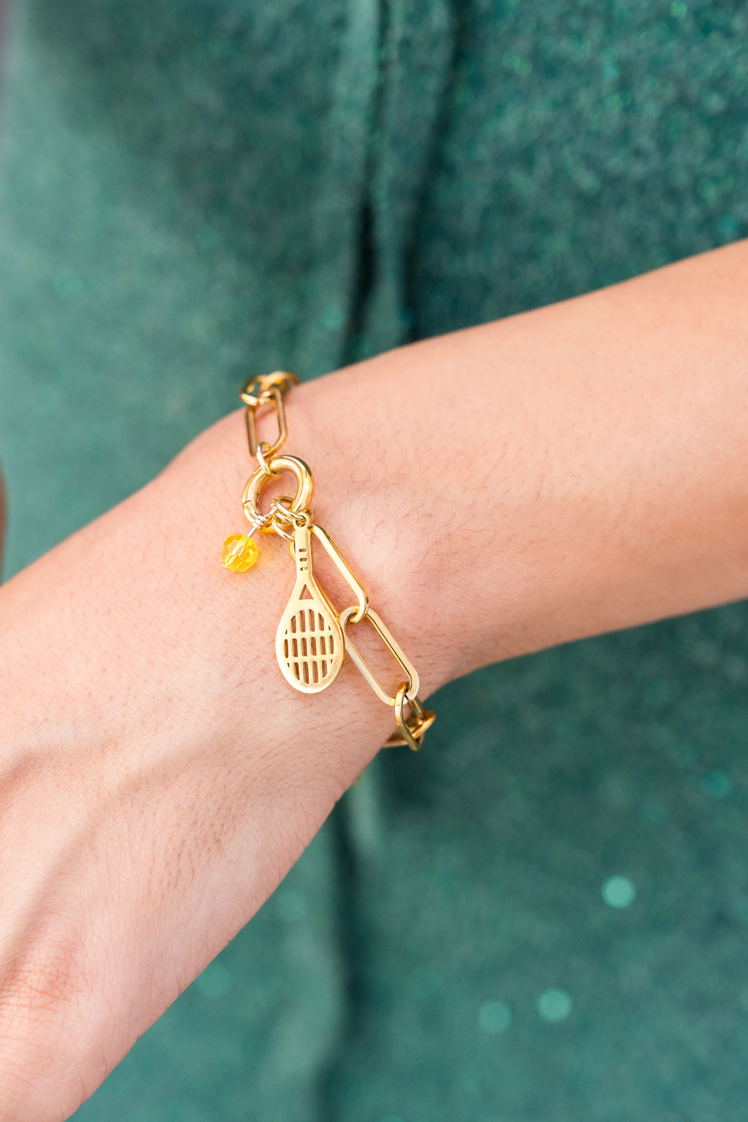 This gold paperclip bracelet artfully highlights tennis with a glowing citrine crystal that captures the essence of a tennis ball. Complemented by a polished racket charm, it offers a sophisticated tribute to the sport. Perfect for courtside elegance or daily wear, it pairs seamlessly with citrine and crystal tennis bracelets for stylish stacking.