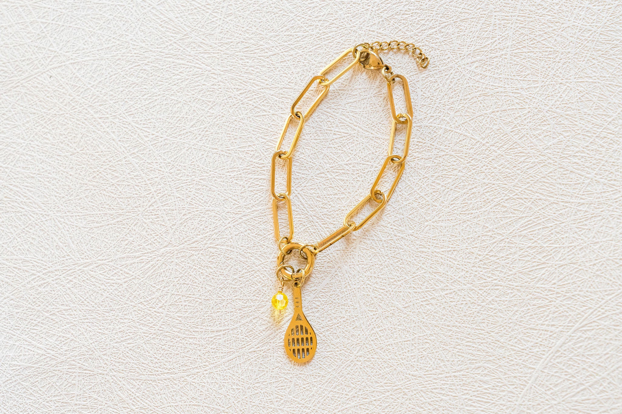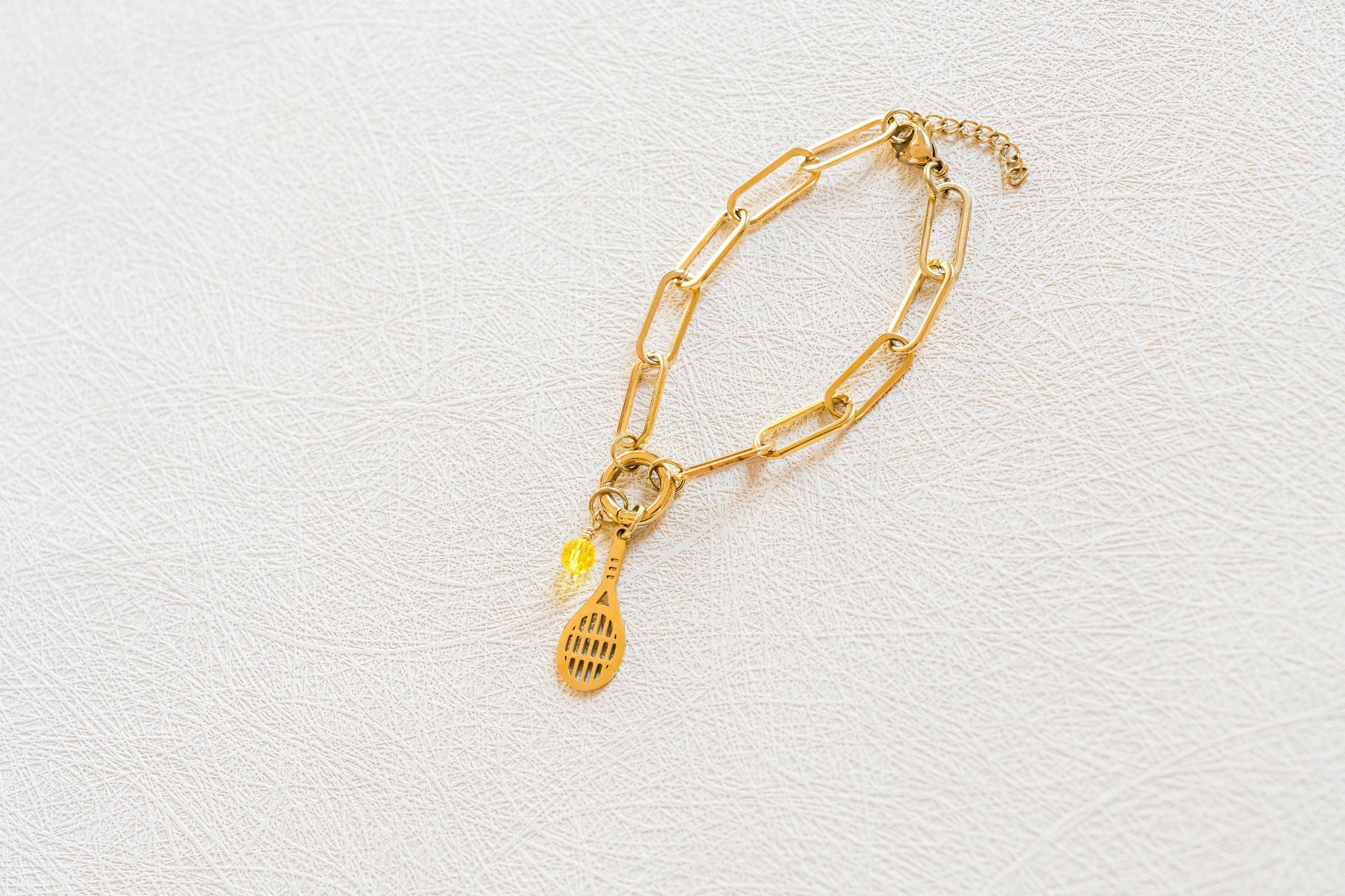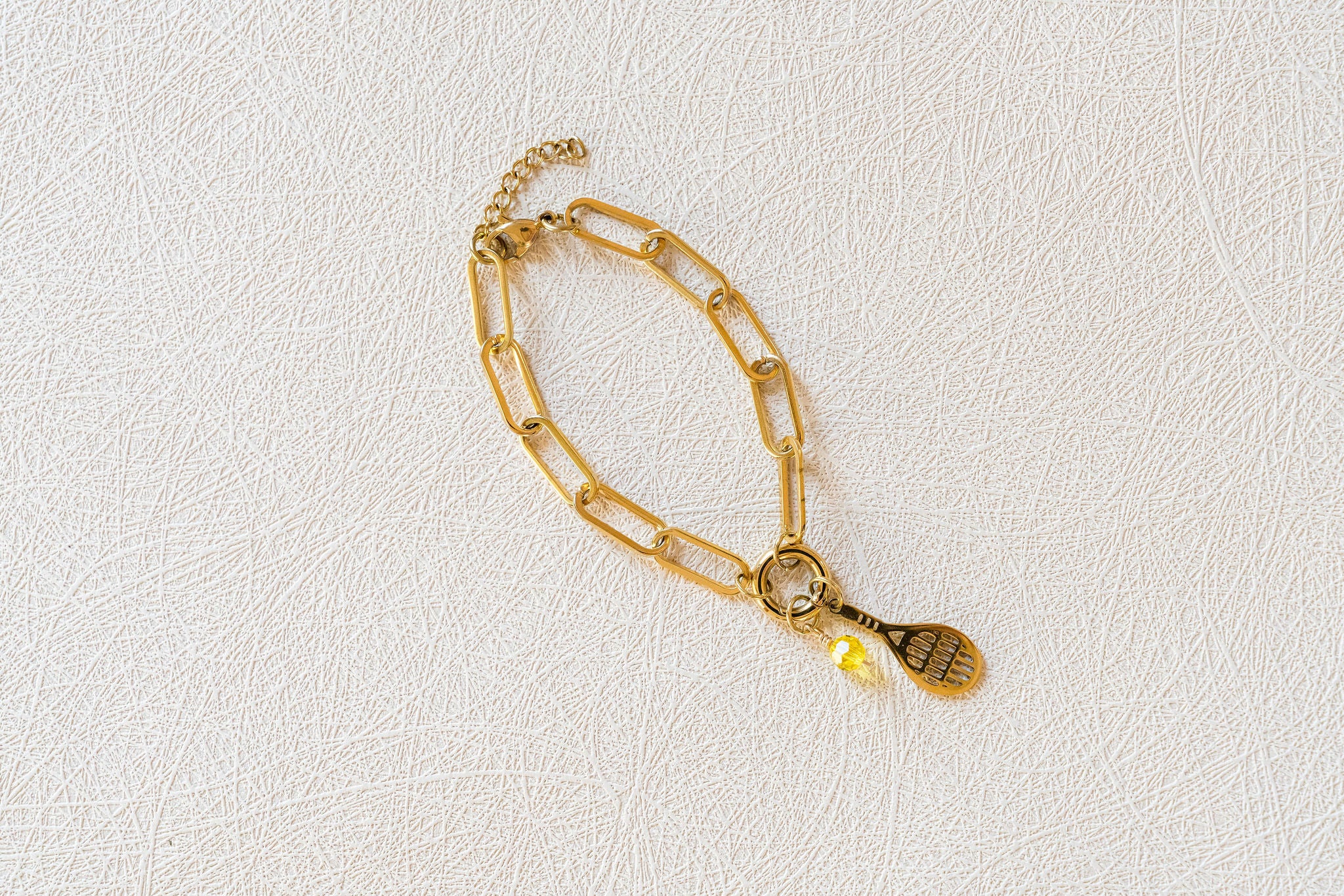 This gold paperclip bracelet artfully highlights tennis with a glowing citrine crystal that captures the essence of a tennis ball. Complemented by a polished racket charm, it offers a sophisticated tribute to the sport. Perfect for courtside elegance or daily wear, it pairs seamlessly with citrine and crystal tennis bracelets for stylish stacking.