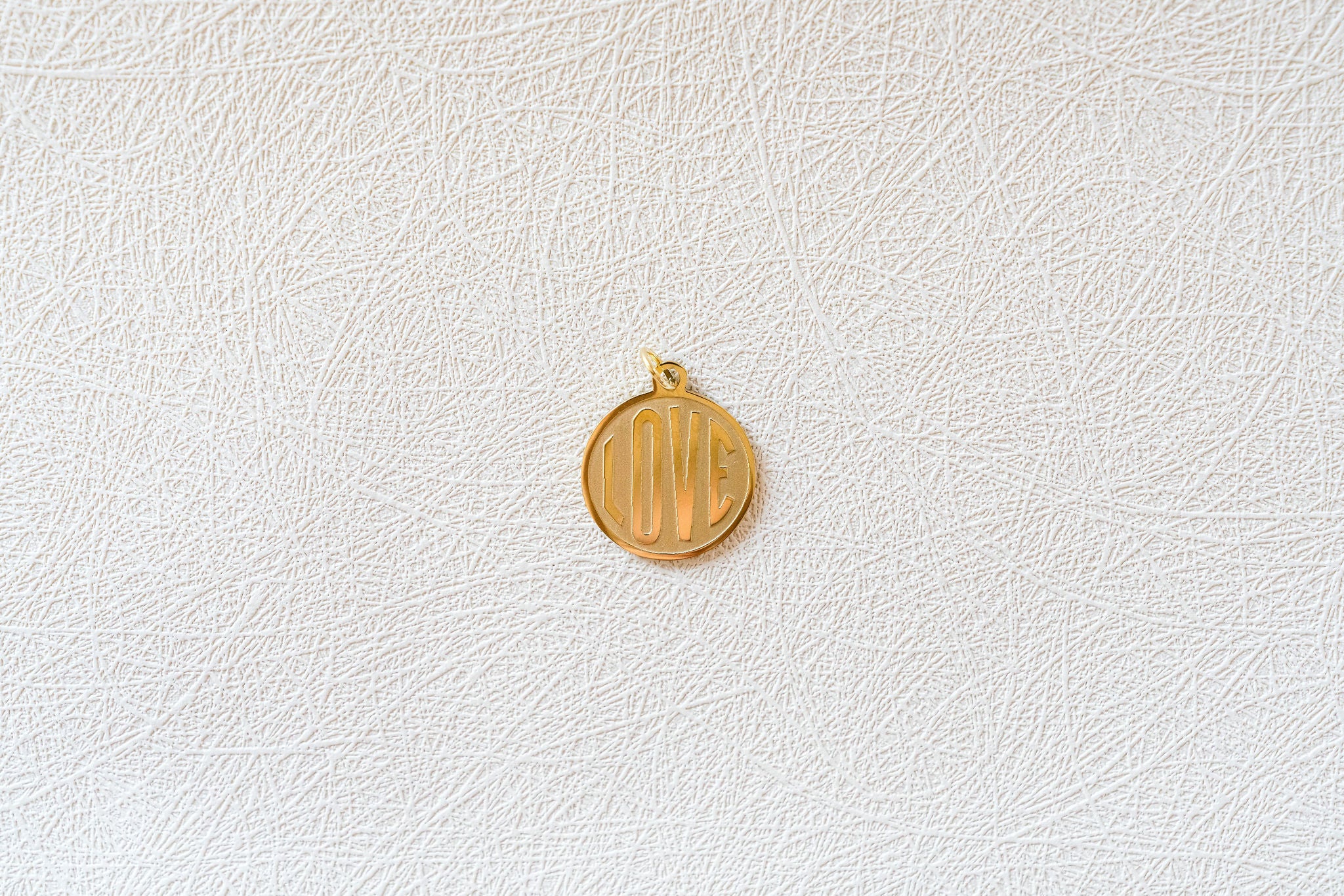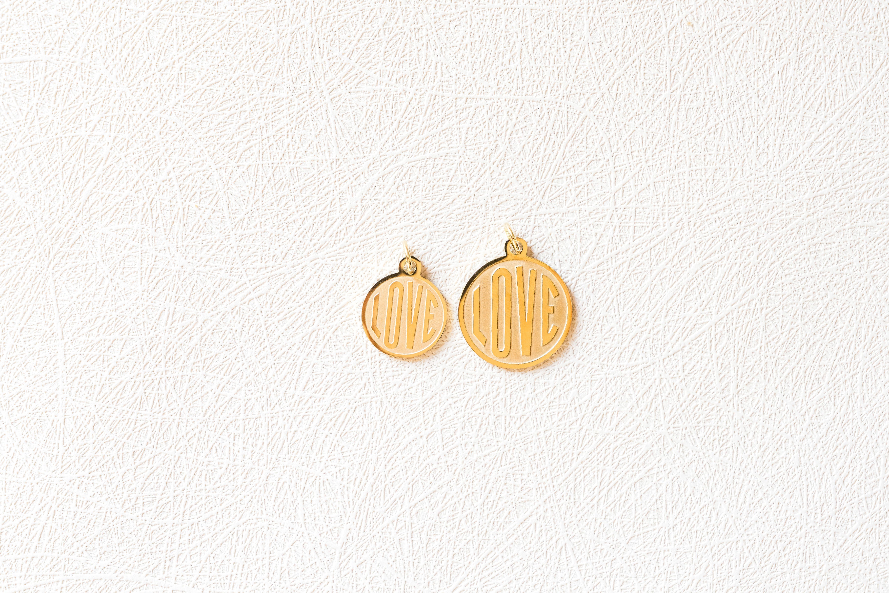 Sleek and classic, this round medallion charm is engraved with the word “love” for a touch of timeless elegance. Minimal yet meaningful, it’s a versatile piece designed to layer effortlessly or shine on its own. Available in two sizes small and large.