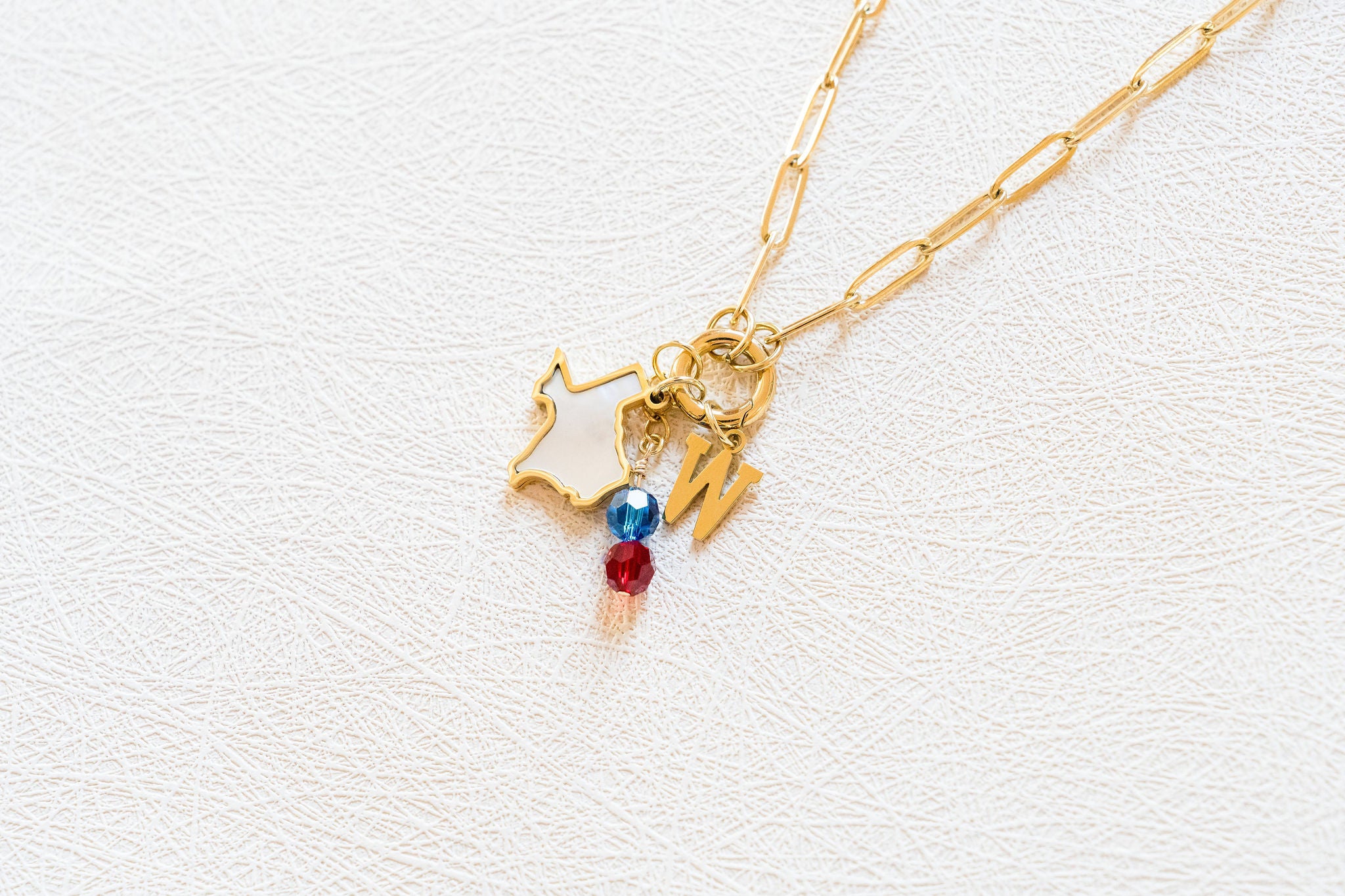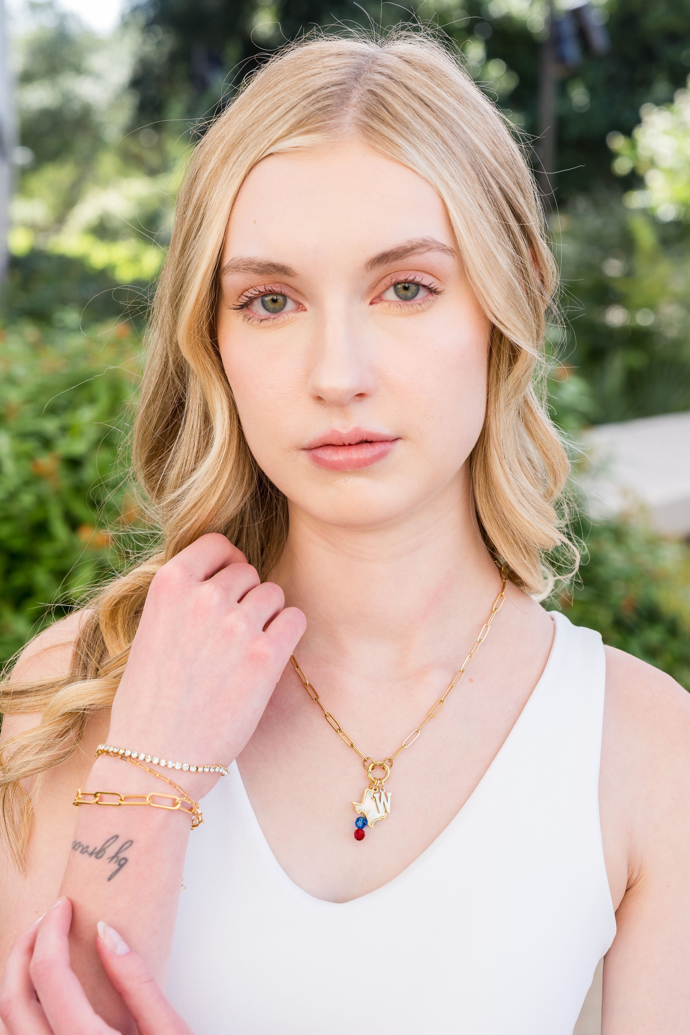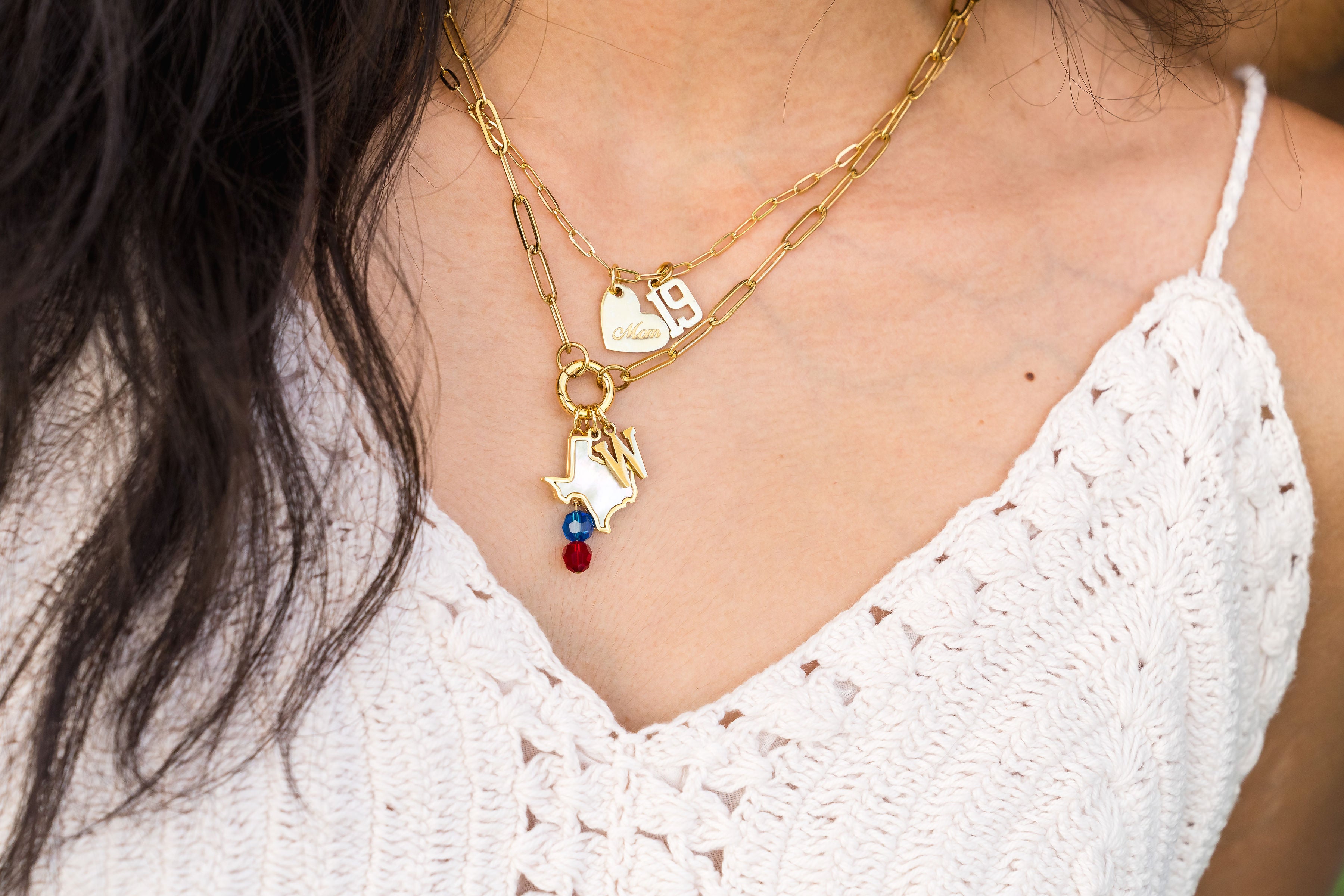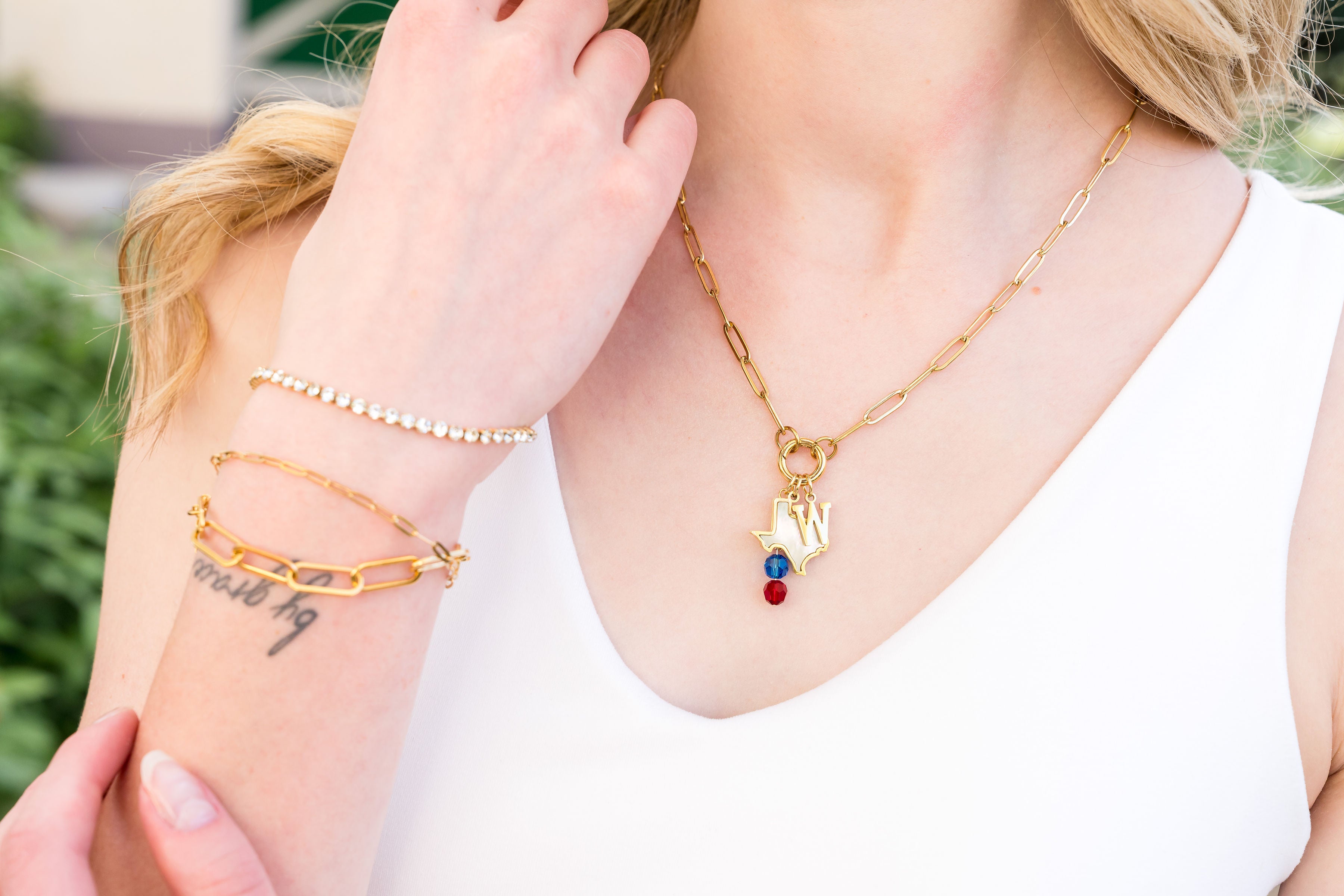 From Friday night lights to championship runs, the Chap Victory Necklace keeps Westlake pride close. With a mother-of-pearl Texas charm, a bold W, and crystals in red and blue, it’s built on elegant paperclip links with a charm keeper that lets every symbol shine.