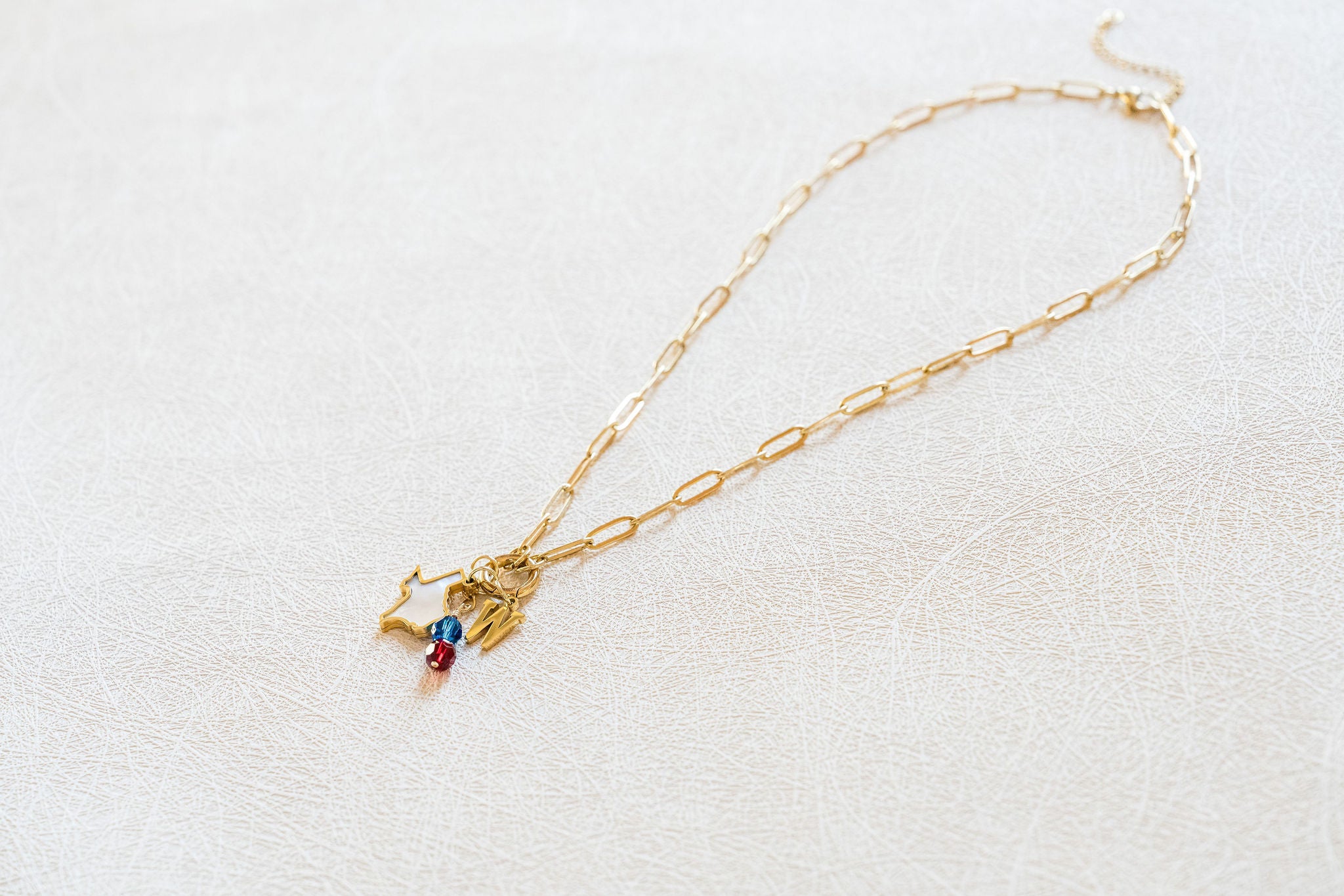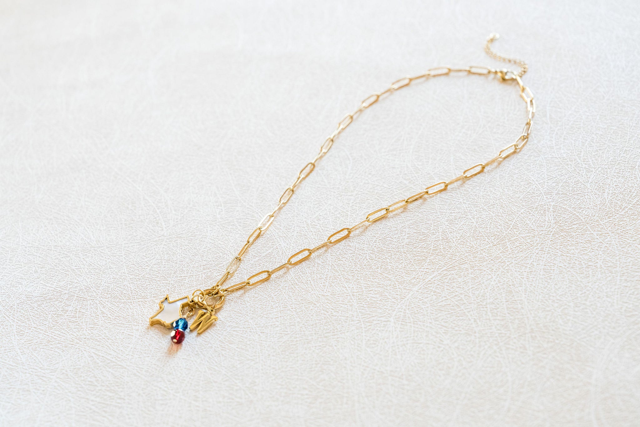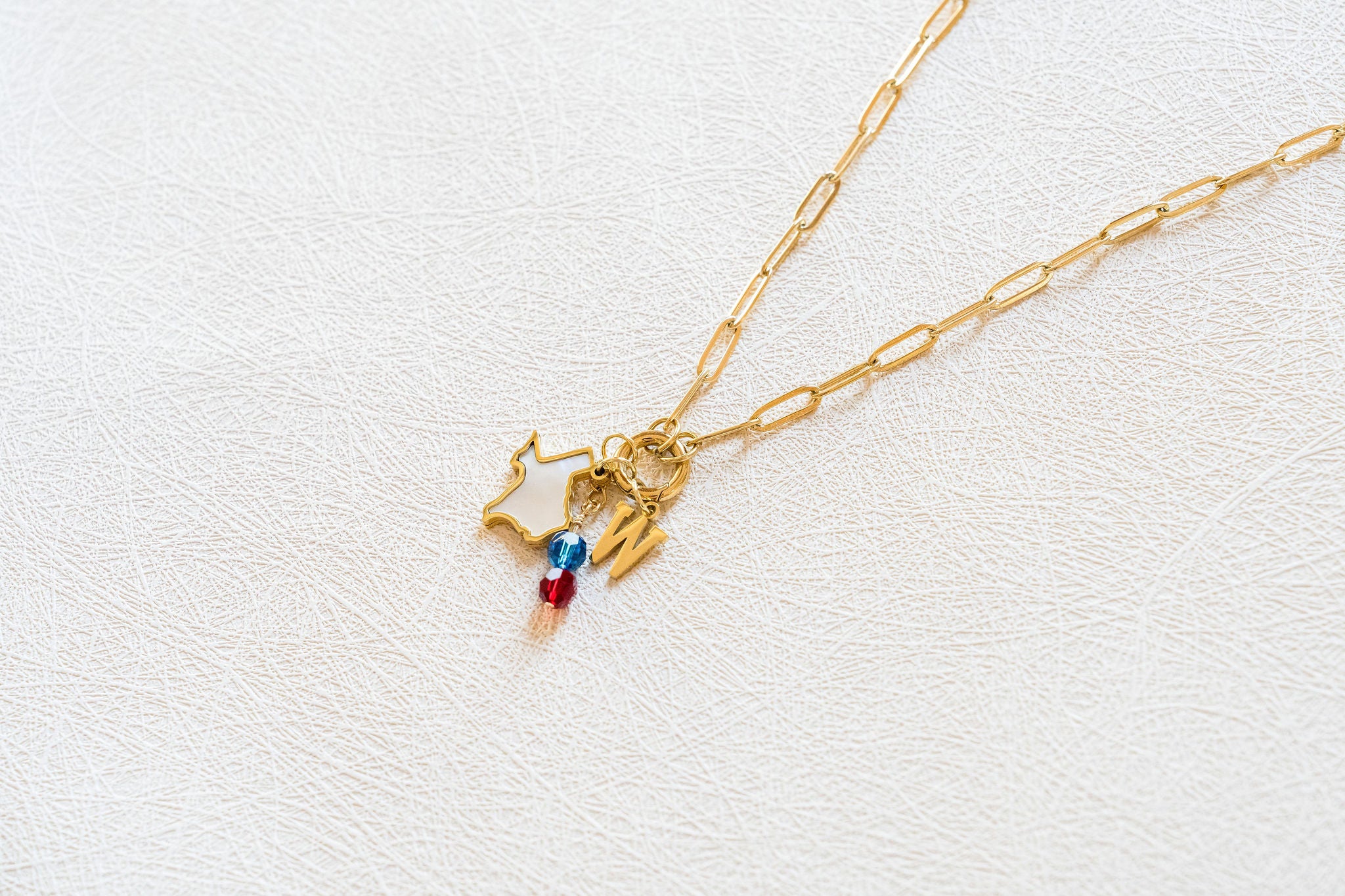 Chain made with 316L surgical grade stainless steel coated in 18K PVD gold, meaning it’s sweat-proof, swim-proof, and shower-safe. Texas charm made with 316L surgical stainless steel accented with genuine mother-of-pearl, each piece is naturally unique. Austrian crystals, hand wire wrapped on a gold filled head pin. Compatible with all Charm Theory charms Clasp- 18k gold PVD lobster clasp