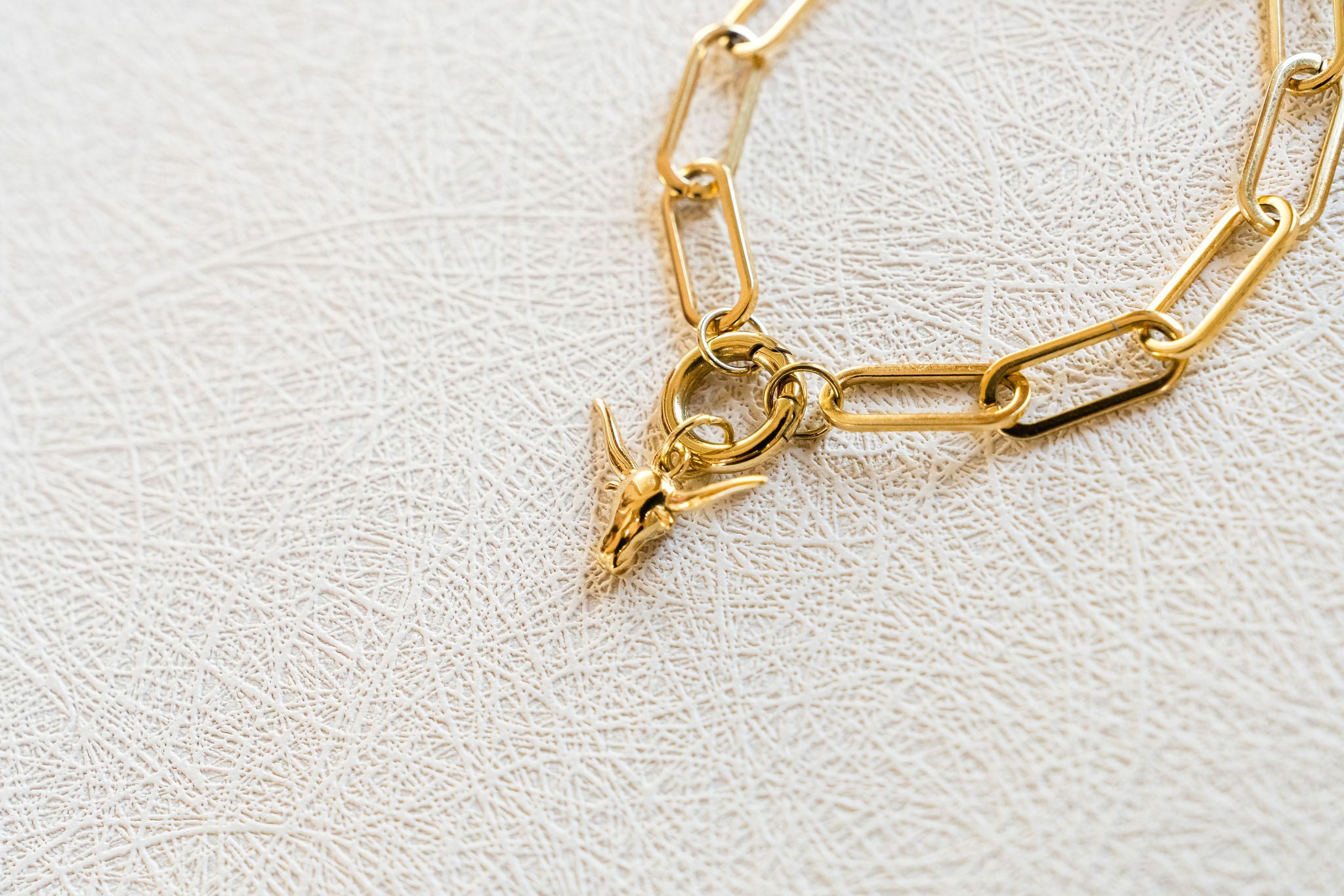 Elevate your game day style with the Victory Horn Bracelet, a bold gold paperclip chain accented by a striking Longhorn charm. Designed to capture the spirit of victory, this bracelet stands out whether you're celebrating a win or enhancing your everyday look. Its substantial links complement layering perfectly, pairing seamlessly with crystal tennis and fine paperclip bracelets for a sophisticated, expert-crafted finish.
