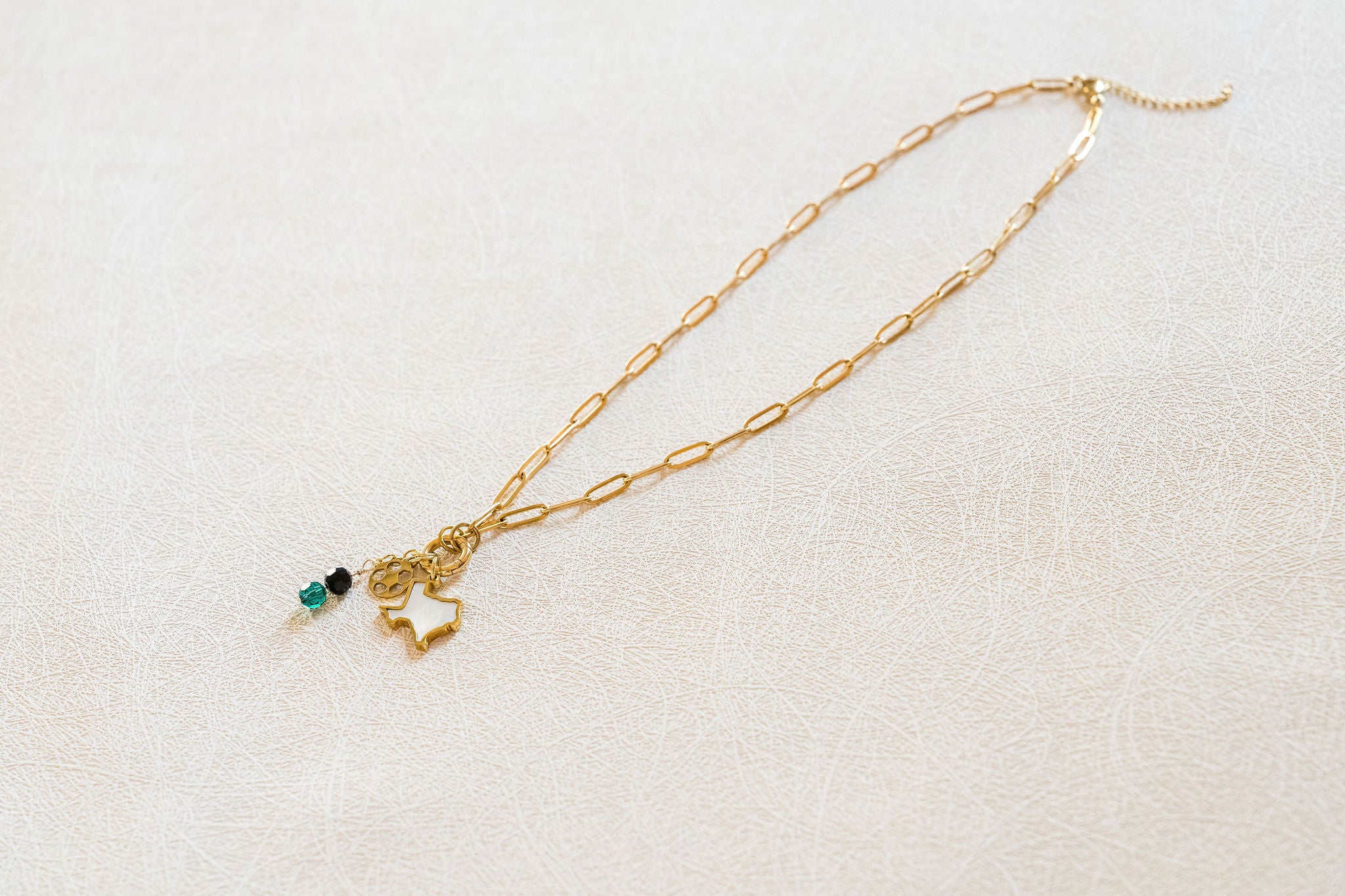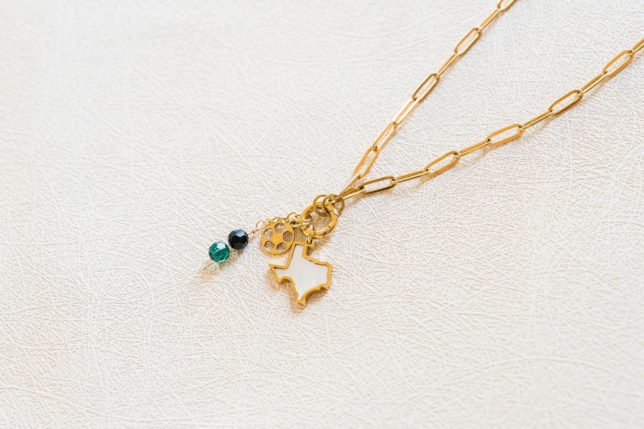 Chain made with 316L surgical grade stainless steel coated in 18K PVD gold, meaning it’s sweat-proof, swim-proof, and shower-safe. Texas charm made with 316L surgical stainless steel accented with genuine mother-of-pearl, each piece is naturally unique. Austrian crystals, hand wire wrapped on a gold filled head pin. Compatible with all Charm Theory charms Clasp- 18k gold PVD lobster clasp