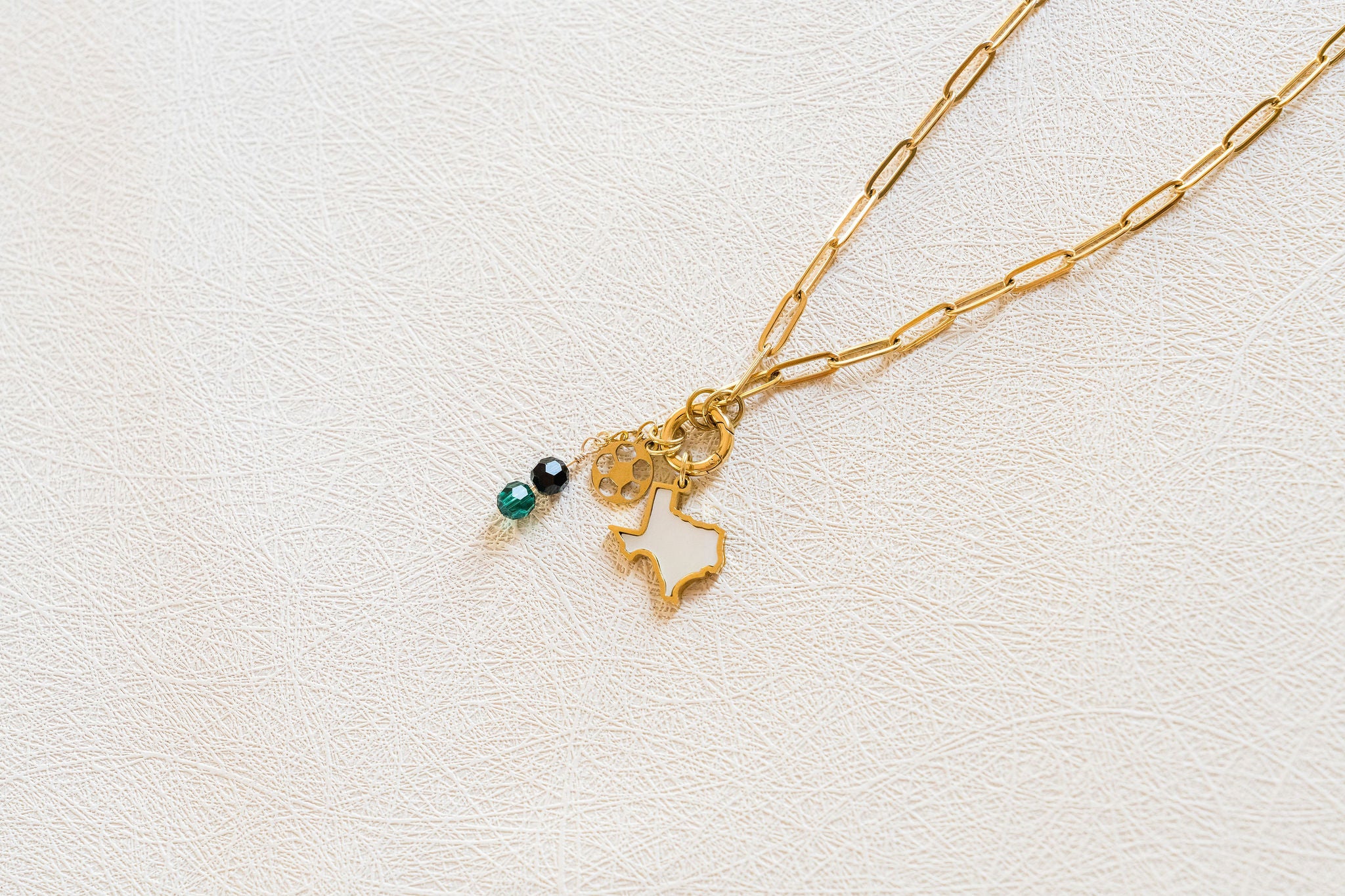 The Verde Spark Necklace balances bold elegance with unmistakable Austin spirit. Crafted on polished gold links, it features a radiant mother-of-pearl Texas charm, a detailed soccer ball, and crystal accents in signature green and black. Sophisticated yet spirited, it’s a versatile piece that transitions seamlessly from the stands to the city.