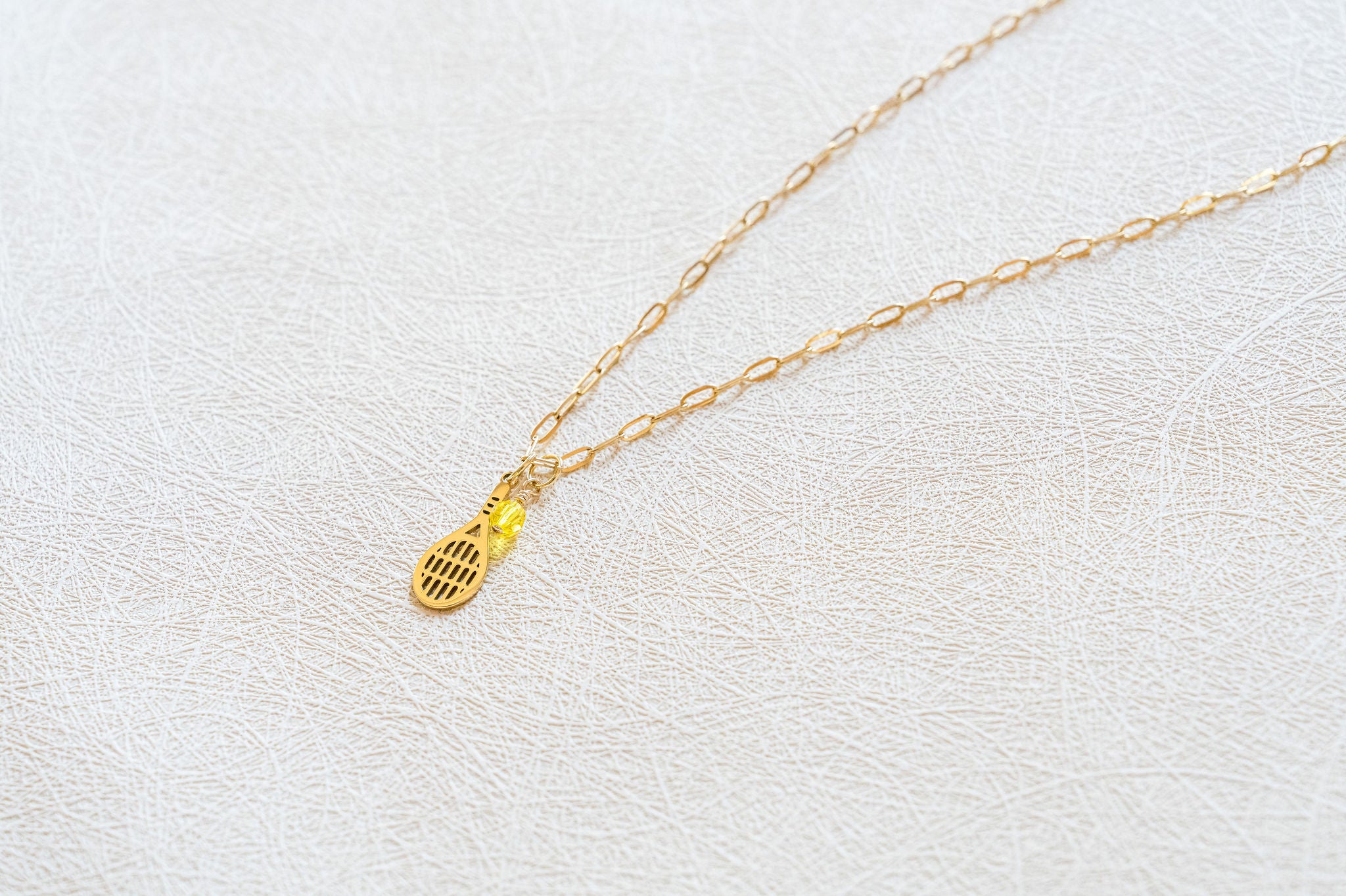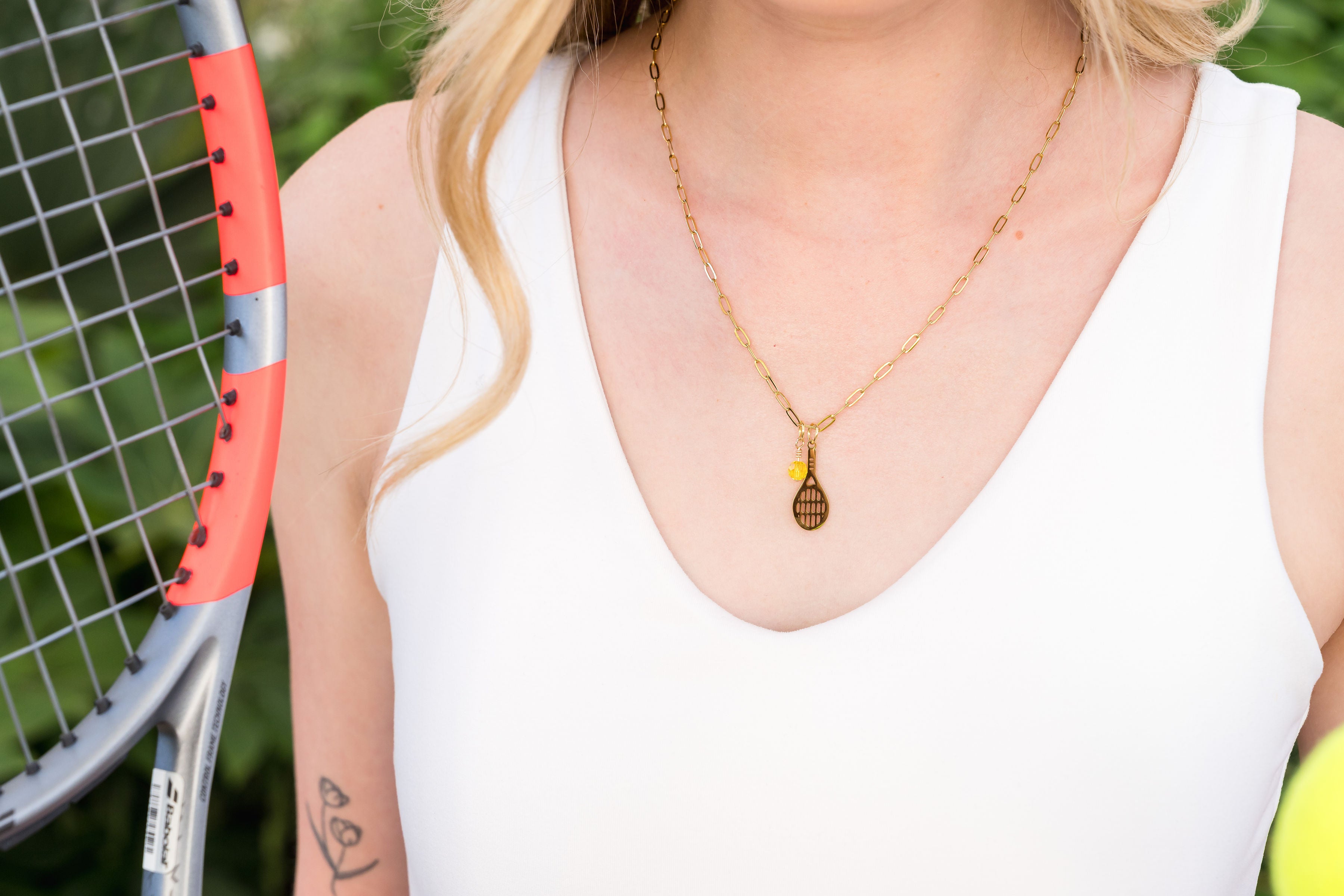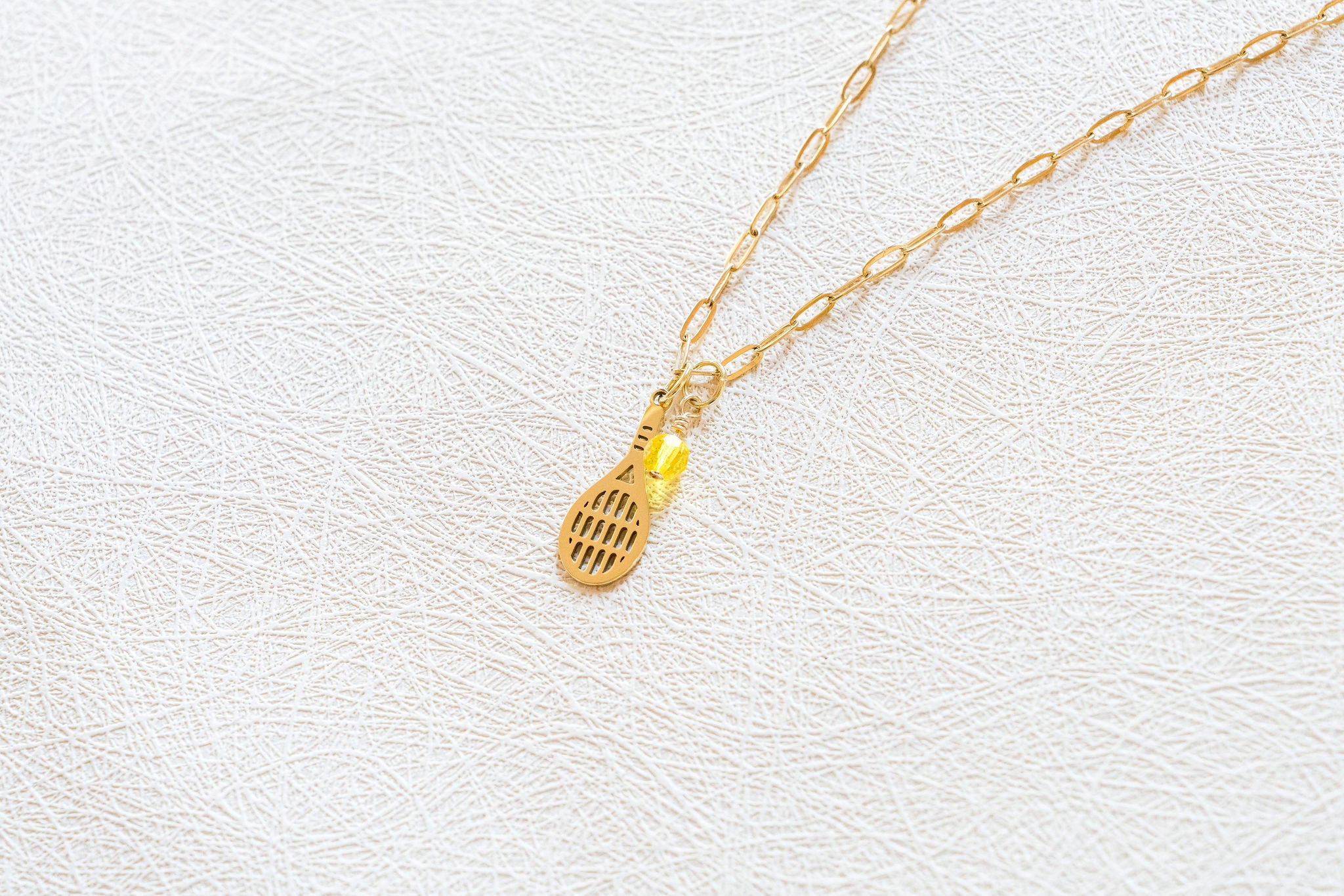 Love means everything—especially here. The Love All Tennis Necklace pairs a golden mini paperclip chain with a racket charm and a bright citrine crystal tennis ball. Built for players, fans, and champions, it’s a game-day essential that shines long after match point.